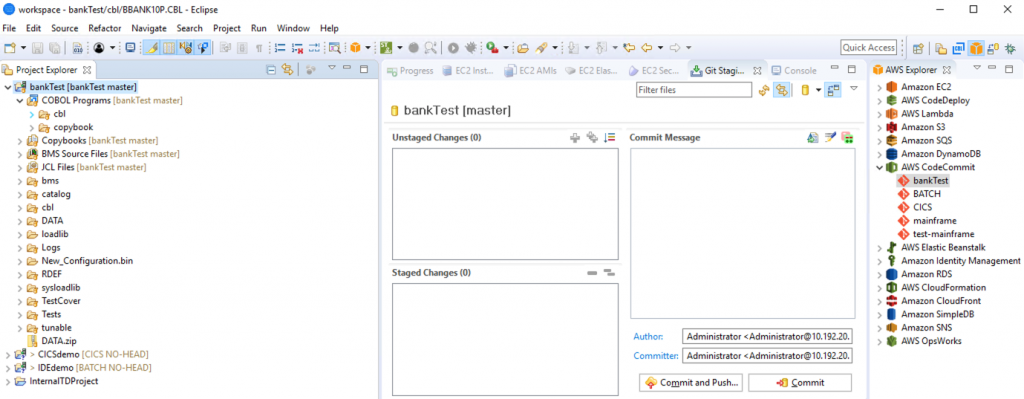 1- AWS CodeCommit es un servicio de control de código fuente totalmente administrado que aloja repositorios basados en Git protegidos. Permite a los desarrolladores, por ejemplo, el lenguaje procesal COBOL, colaborar fácilmente en el código en un ecosistema seguro y altamente escalable. AWS CodeCommit elimina la necesidad de operar su propio sistema de control de código fuente o preocuparse por la escalabilidad de la infraestructura. Con el servicio AWS CodeCommit, los desarrolladores de COBOL pueden almacenar de forma segura cualquier cosa, desde el código fuente hasta los archivos binarios. Otra facilidad es usar Eclipse o Visual Studio IDEs para realizar cambios de código en un repositorio de AWS CodeCommit. La integración con estos kits de herramientas está diseñada para funcionar con credenciales de Git y un usuario de Identity & Access Management (IAM).