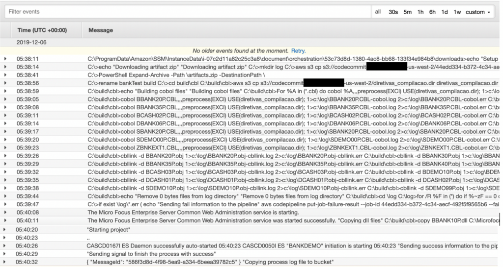 La ejecución remota de comandos, utilizada para realizar el proceso de validación y compilación de código COBOL, puede enviar registros a la plataforma de administración de eventos de AWS, manteniendo así los registros de ejecución del proceso en la misma plataforma, unificando y simplificando el proceso de monitoreo y solución de problemas como se muestra en la figura 7. Un ejemplo para automatizar este proceso usando un archivo por lotes está disponible aquí (build_ssm.bat).