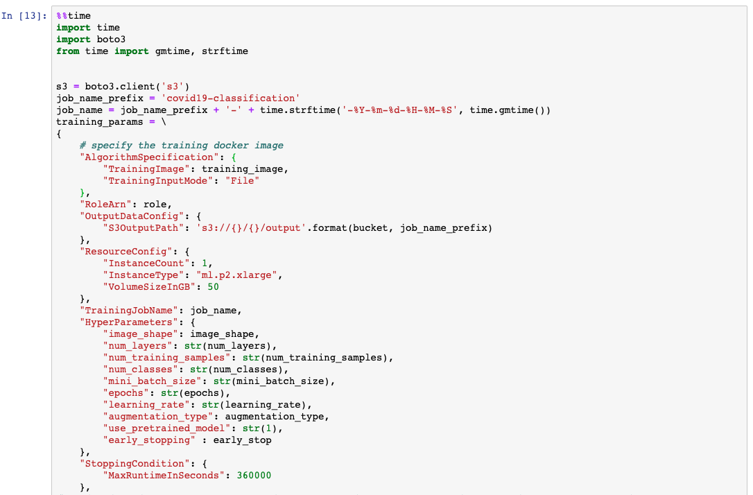 En la celda inferior informaremos los hyperparameters para el modelo, para este post utilizaremos una ResNet18 con transfer learning, 20 epochs y learning rate de 0.0005. Además de eso vamos a utilizar la funcionalidad nativa de data augmentation para aumentar el número de samples y configuración de early stop. La instancia utilizada para el entrenamiento es la ml.p2.xlarge.