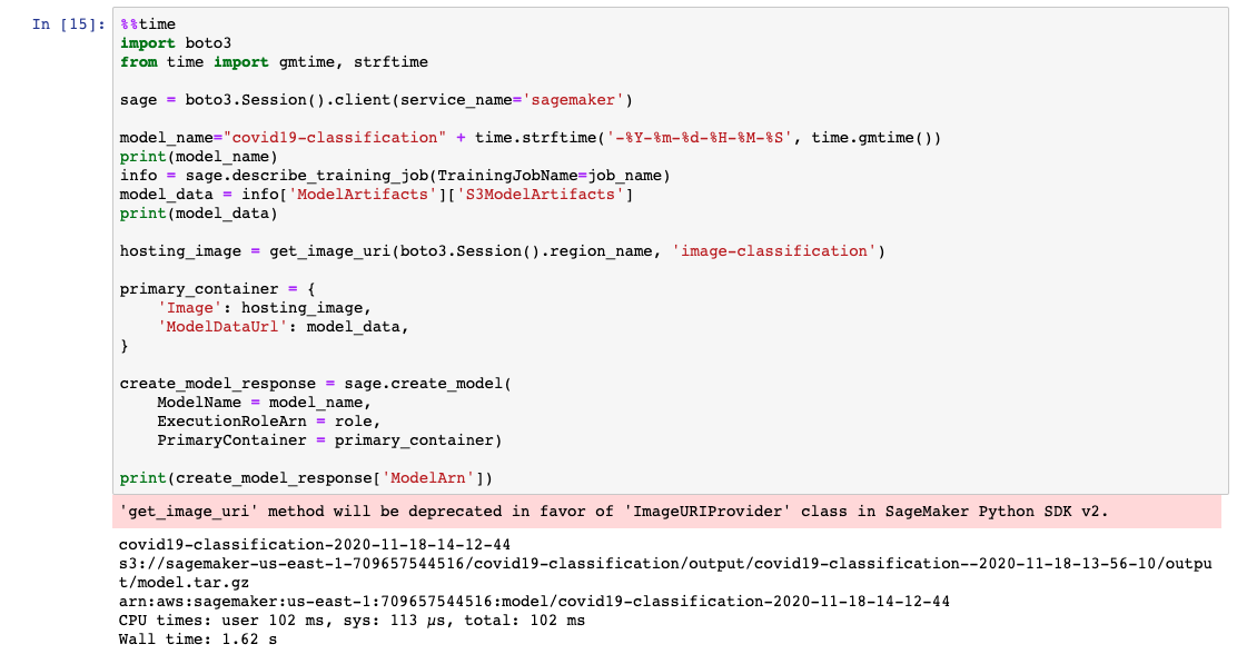 En la celda de abajo, vamos a configurar un modelo basado en el resultado del entrenamiento anterior, poseyendo este modelo podemos iniciar un endpoint para inferencias en tiempo real o inferencias en batch.