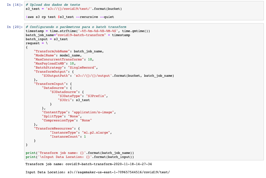 Con el modelo creado, vamos a subir los datos de prueba que hemos separado anteriormente y crear un job en batch para inferencias. Como fue citado anteriormente, podemos también configurar un endpoint con el modelo y ejecutar inferencias en tiempo real, pero para el objetivo de este blog post inferencias en batch son suficientes. El job evaluará las inferencias de las imágenes especificadas en el bucket S3 y almacenará el resultados en archivos json en el directorio output.