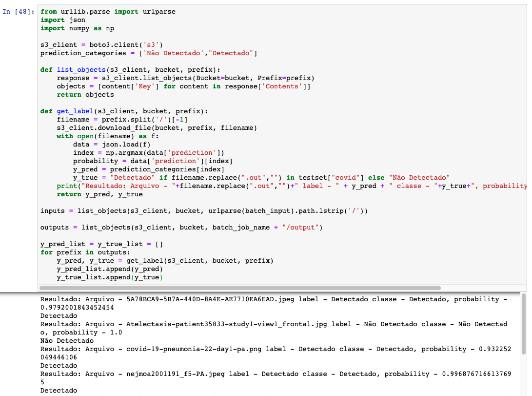 Debido al carácter aleatorio de separación de los datos los resultados obtenidos pueden variar, en mis pruebas realizadas el modelo clasificó todos los pacientes correctamente dentro de las imágenes de prueba. Caso deseemos buscar mejores resultados podemos utilizar la feature del sagemaker llamada automatic model tunning, mas informaciones en este link: https://docs.aws.amazon.com/sagemaker/latest/dg/automatic-model-tuning-how-it-works.html