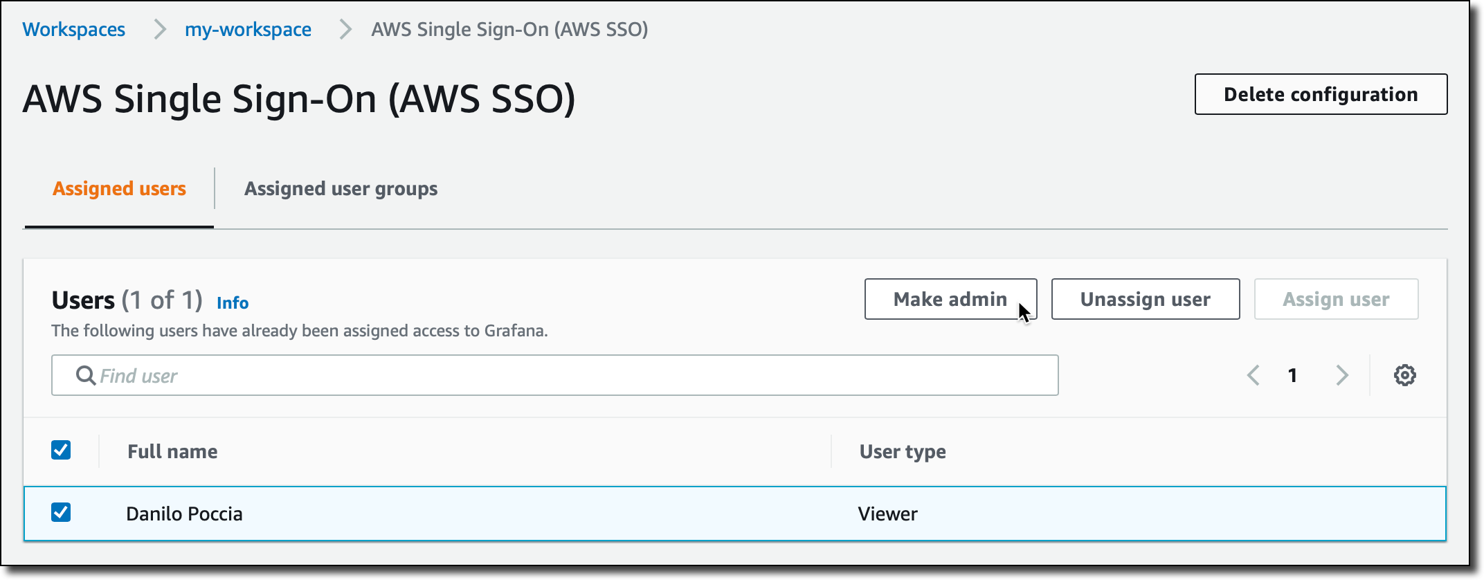 I need to assign at least one user or group to the Grafana workspace to be able to access the workspace URL. I choose Assign new user or group and then select one of my AWS SSO users.