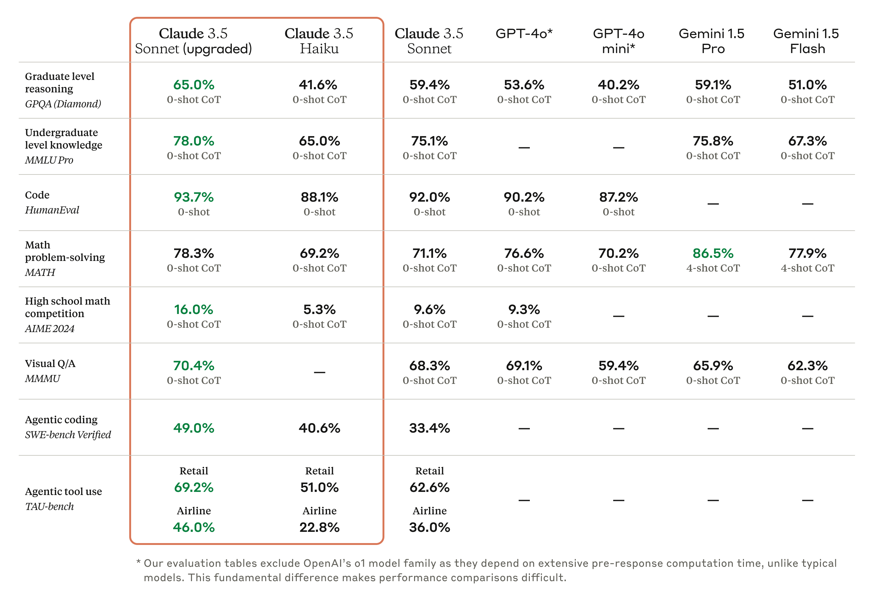 According to Anthropic, the upgraded Claude 3.5 Sonnet delivers across-the-board improvements over its predecessor, with significant gains in coding, an area where it already excelled. The upgraded Claude 3.5 Sonnet shows wide-ranging improvements on industry benchmarks. On coding, it improves performance on SWE-bench Verified from 33% to 49%, scoring higher than all publicly available models. It also improves performance on TAU-bench, an agentic tool use task, from 62.6% to 69.2% in the retail domain, and from 36.0% to 46.0% in the airline domain. The following table includes the model evaluations provided by Anthropic.