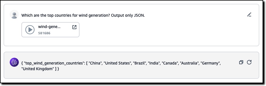 user_message = "Which are the top countries for wind power generation? Answer only in JSON."