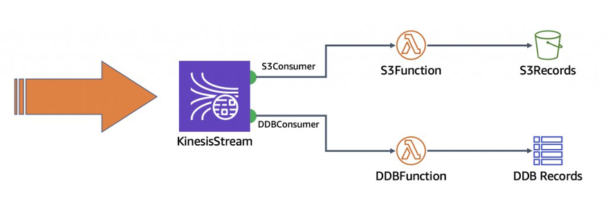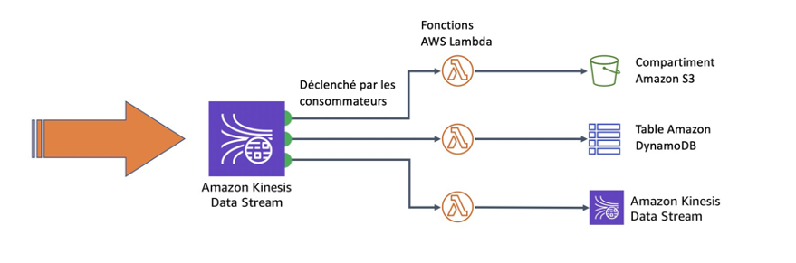 L’un des principaux avantages du traitement de flux (en anglais « streaming ») est d’avoir plusieurs applications consommatrices, chacune consommant des données du même flux de Kinesis Data Streams. Par exemple, une application peut agréger les enregistrements dans le flux de données, les mettre dans un batch et écrire le batch dans Amazon Simple Storage Service (Amazon S3) pour une rétention à long terme. Une autre application peut enrichir les enregistrements et les écrire dans une table Amazon DynamoDB. Enfin, dans le même temps, une troisième application peut filtrer le flux et écrire un sous-ensemble des données dans un autre flux de Kinesis Data Streams pour, par example, être consommé par une application de notification.
