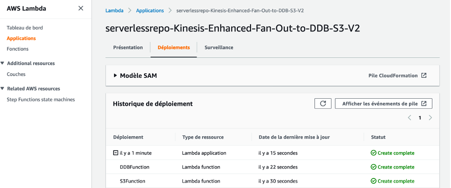 Nous avons créé l’application Kinesis-Enhanced-Fan-Out-to-DDB-S3 et l’avons rendue disponible via l‘AWS Serverless Application Dispository. Vous pouvez déployer l’application dans votre compte AWS et l’application peut être déployée dans la région eu-west-3. Sur la page d’état du déploiement, vous pouvez surveiller les ressources en cours de déploiement.