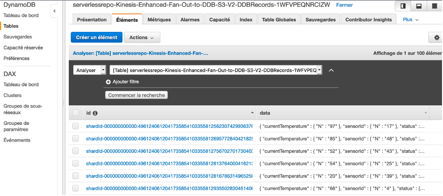 La capture d’écran suivante montre les 100 premiers éléments que votre base de données a absorbés à partir de la DDBFunction attachée à KinesisStream via DDBConsumer.