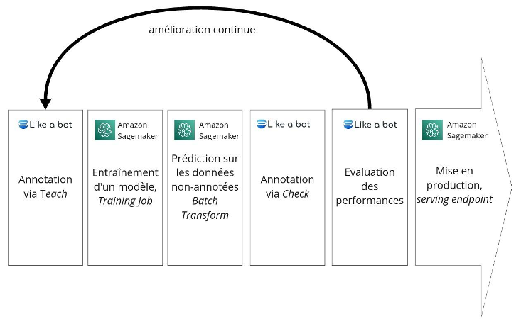 À l’issue des précédentes étapes du processus, si les performances des modèles entraînés ne sont pas satisfaisantes, il est nécessaire d’entrer dans une phase itérative d’amélioration continue. Celle-ci consiste à répéter les tâches précédentes en ajoutant des données et en recommandant des prédictions susceptibles d’êtres des faux positifs. Plus un utilisateur avance dans la phase d’amélioration continue, moins il aura de données à ajouter dans le module LikeaBot Teach. Ce seront donc les modèles observateurs, automatiquement orchestrés par Amazon SageMaker, qui recommanderont des données susceptibles d’être des faux positifs depuis le module Check de LikeaBot. Cette évolution du processus permet de converger vers des performances satisfaisantes tout en optimisant la quantité de données à annoter.