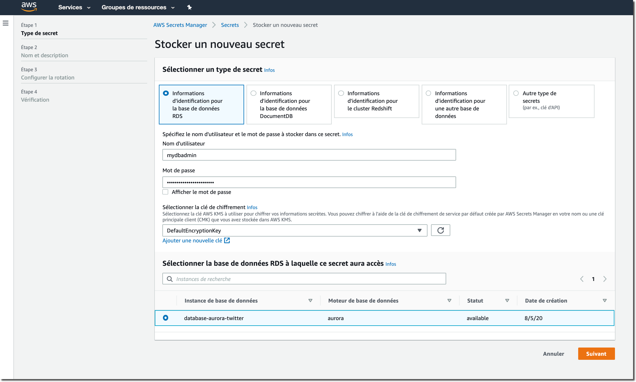 Voyons comment stocker un secret en utilisant la console AWS Secrets Manager. Tout d’abord, je clique sur Stocker un nouveau secret pour accéder à l’assistant de création de nouveaux secrets. Pour mon instance RDS Aurora, il est simple de sélectionner l’instance et de fournir le nom d’utilisateur et le mot de passe initiaux pour se connecter à la base de données.