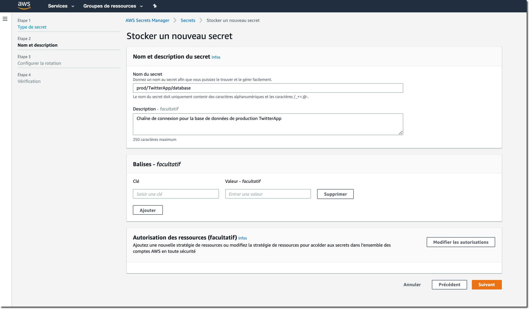 Ensuite, je dois saisir un nom et une description pour accéder à mon secret. Vous pouvez utiliser le système de dénomination que vous souhaitez.