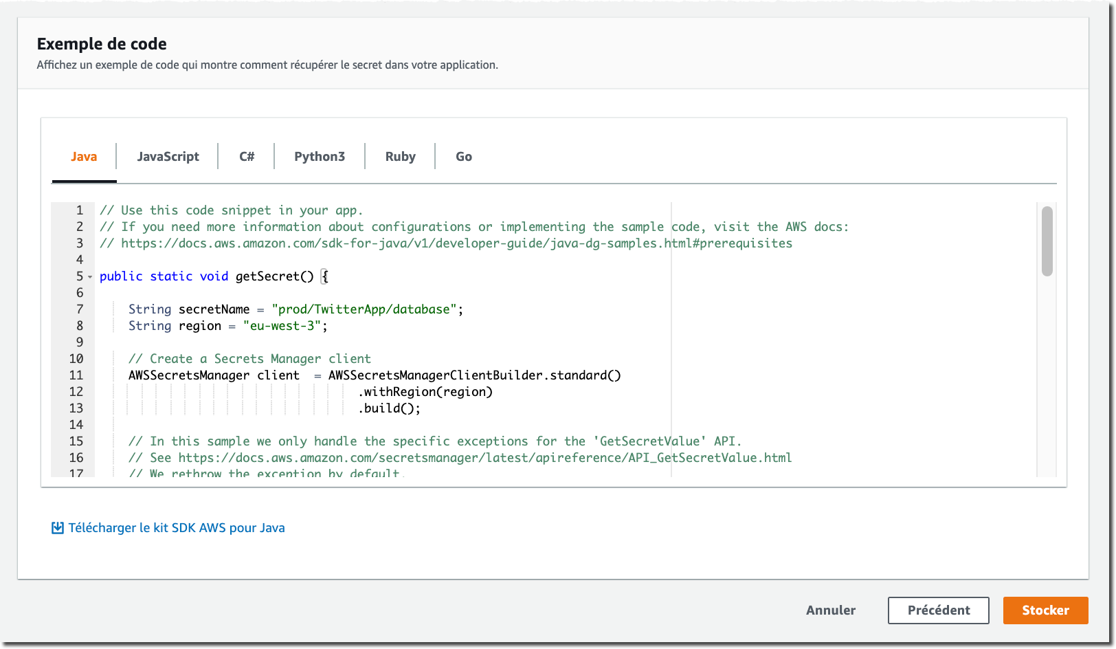 À partir de maintenant, si j’ai besoin d’accéder à ces secrets, je ferais simplement un appel d’API. Voyez ensuite un exemple de comment accéder à vos secrets en utilisant le Kit SDK AWS pour Python (Boto3).