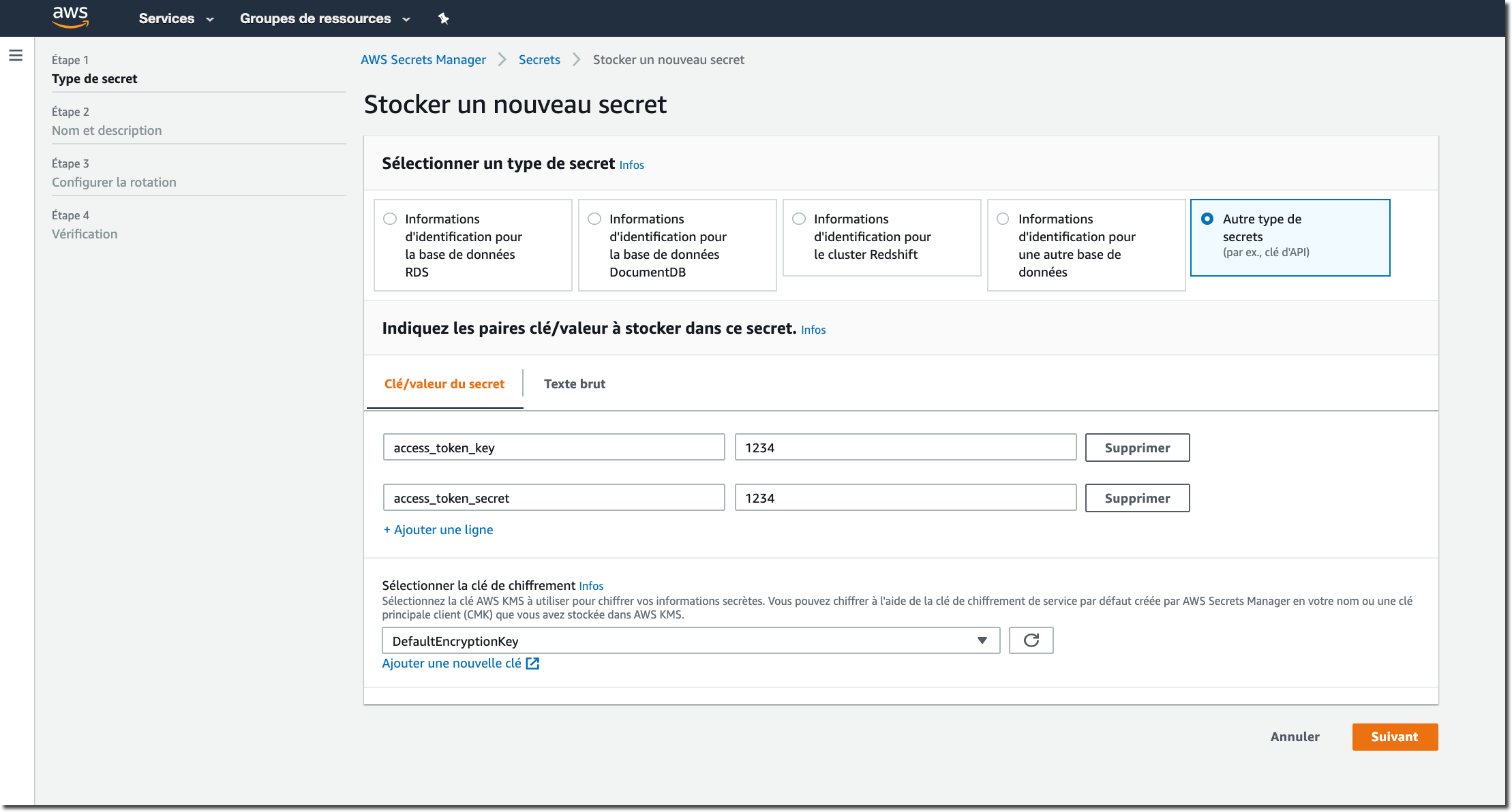 AWS Secrets Manager peut être utilisé pour bien plus que des mots de passe. Je peux stocker des identifiants OAuth, des données binaires, et encore plus. Voyons comment stocker les clés OAuth de mon application Twitter.