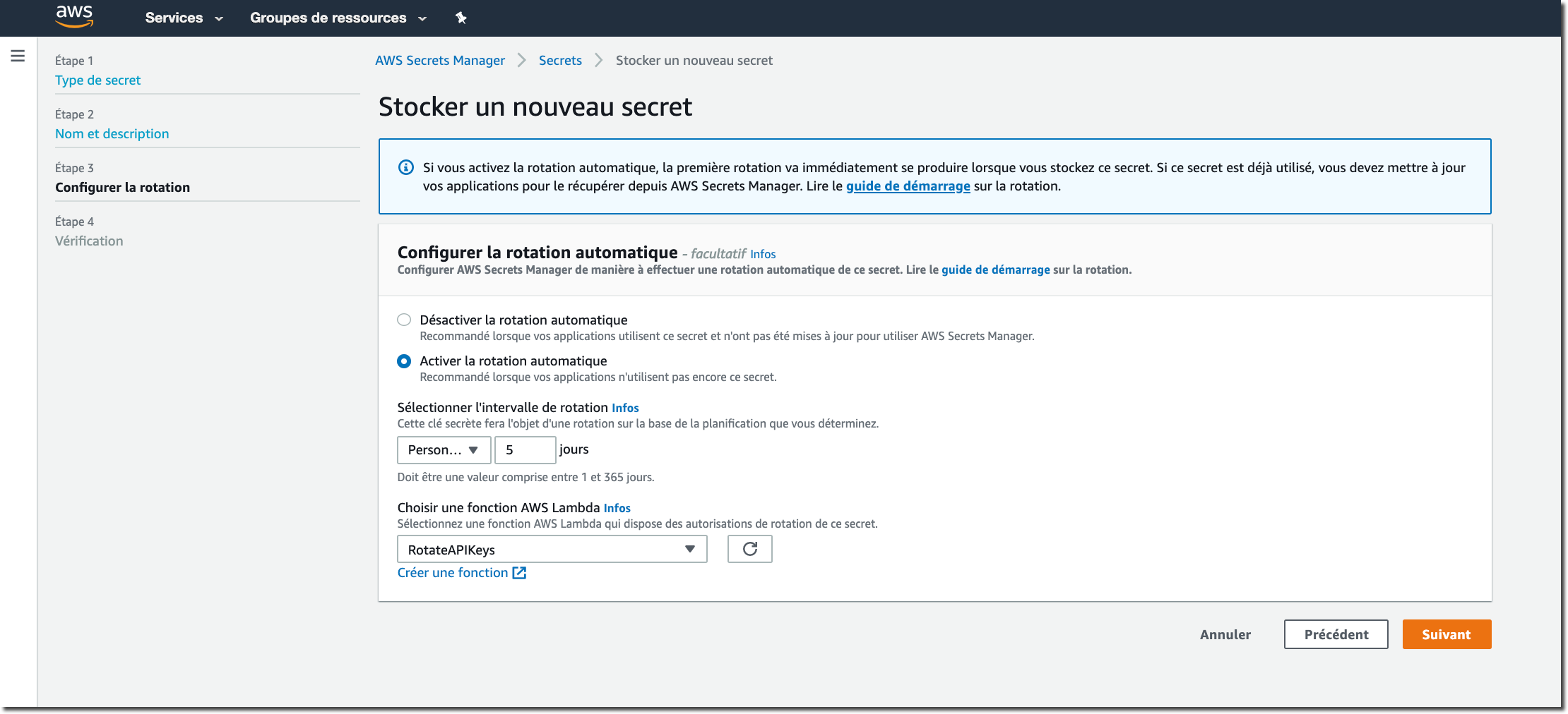 Ensuite, nous allons configurer la rotation du secret pour utiliser la fonction AWS Lambda fournie par AWS Secrets Manager pour faire la rotation de notre mot de passe tous les 10 jours.