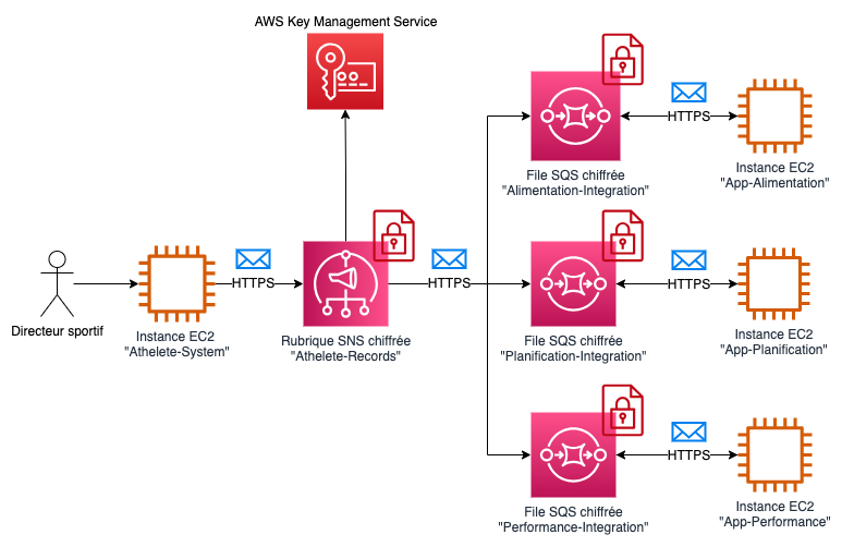 Le topic Amazon SNS et toutes les files Amazon SQS décrites dans ce cas d’utilisation sont chiffrées à l’aide des clés AWS KMS créées par l’équipe sportive. La communication entre les services est basée sur des appels d’API HTTPS. Ce chiffrement de bout en bout protège les données des athlètes en rendant leur contenu inaccessible aux utilisateurs non autorisés ou anonymes pendant que les messages sont en transit ou au repos.