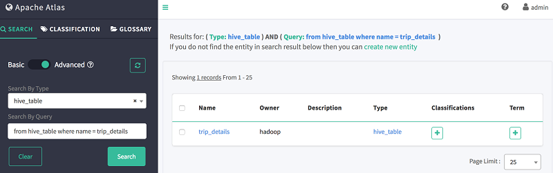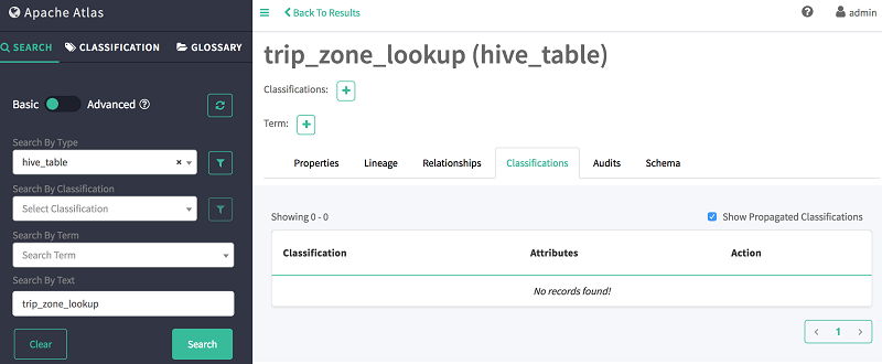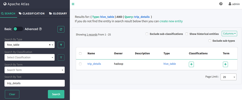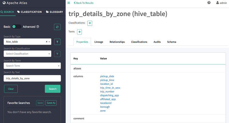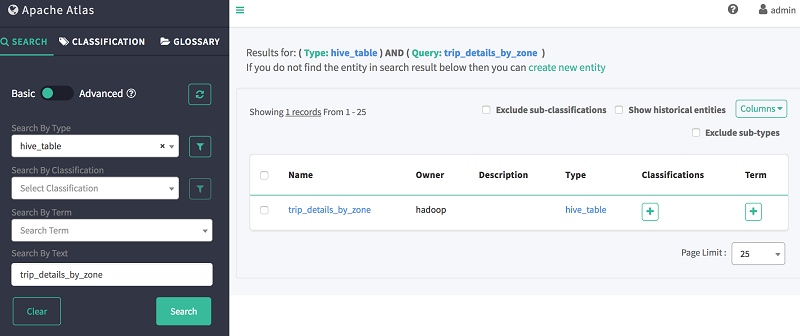 Afin de consulter le data lineage des tables Hive que vous avez créées, vous pouvez utiliser la fonctionnalité de recherche de l’interface Web de Atlas. Par exemple, afin de consulter les informations de Data lineage de la table trip_details_by_zone, renseignez les informations suivantes dans le formulaire de recherche :