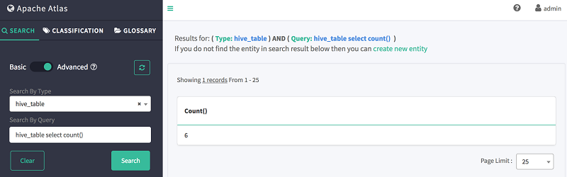 Une fois vos données importées dans Hive. Vous pouvez retourner sur l’interface Web Atlas afin de rechercher et consulter la base de données Hive ou les tables que vous avez importées. Sur le panel gauche de l’interface Atlas, sélectionnez l’onglet Search et saisissez les informations suivantes sur le formulaire de recherche :