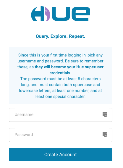 Lors de votre première connexion, vous devrez créer un super utilisateur Hue. Tel que le montre la capture d’écran suivante, assurez-vous ne pas perdre ses informations de connexions.