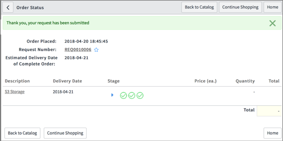 Choisissez Commandez maintenant pour soumettre la demande ServiceNow et provisionner le produit AWS Service Catalog.