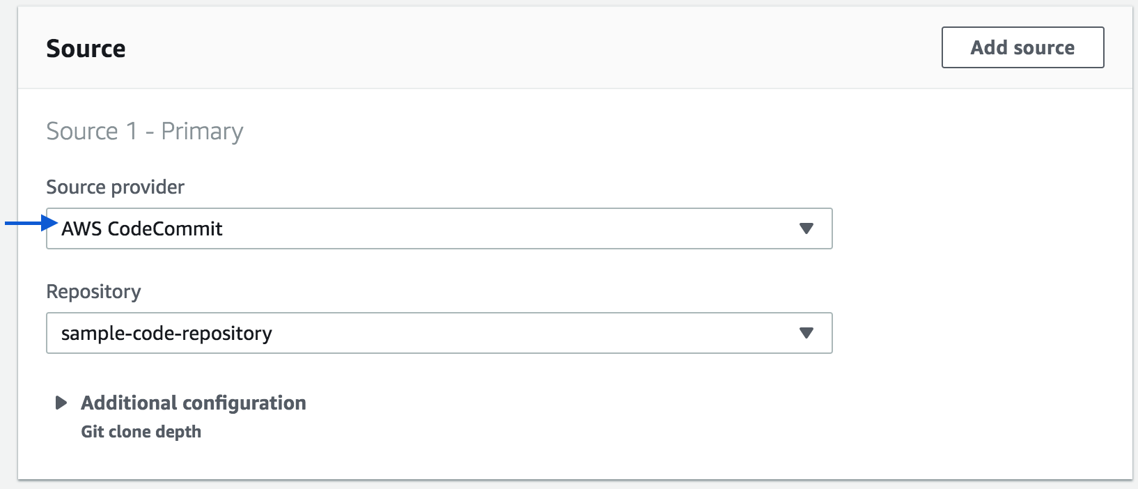 4. Dans Source, pour Fournisseur source, choisissez le type de fournisseur de code source. Dans cet exemple, nous utilisons le nom du référentiel AWS CodeCommit.