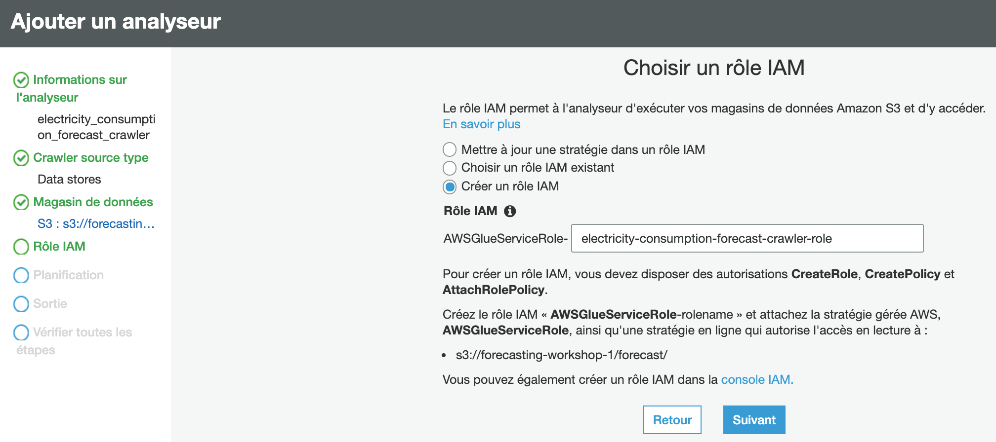 Vous pouvez donc répéter les étapes précédentes pour créer un nouvel analyseur appelé “electricity_consumption_forecast_crawler_parquet” dont le rôle va être de créer une nouvelle table dans le catalogue de données.