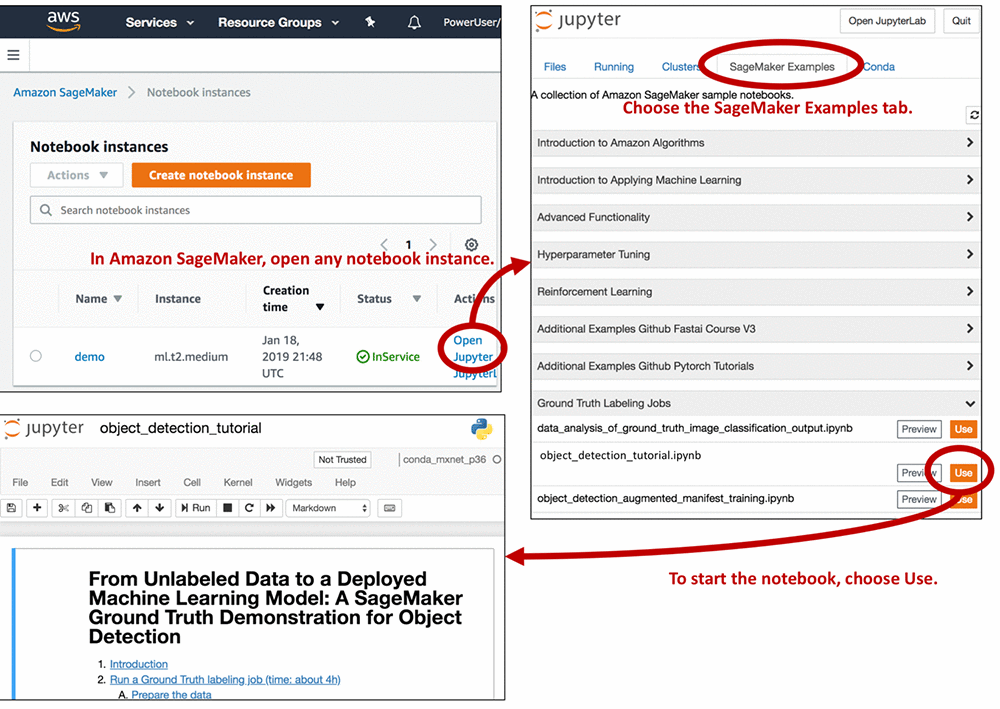 Une fois que l’instance est disponible et prête à l’emploi, nous ouvrons l’environnement de travail, allons sur l’onglet “SageMaker Examples” et lançons le notebook object_detection_tutorial.ipynb comme indiqué dans l’exemple ci-dessous :