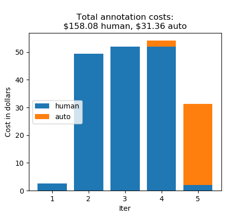 Grâce à l’apprentissage actif (Active Learning) de Ground Truth, le modèle Machine Learning a appris rapidement, ie en 5 itérations, à étiqueter automatiquement 365 images! Il ne reste que 8 images non étiquetées. L’itération 5 envoie les images nécessitant encore une intervention humaine. Examinons les coûts d’étiquetage itération par itération :