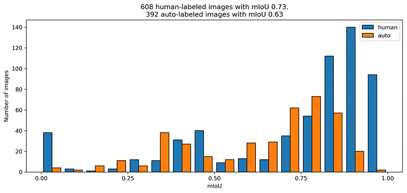 Étiqueter automatiquement un jeu de données est très rentable, mais comment pouvons-nous comparer les résultants d’un étiquetage manuel et automatique? Le graphique mIoU ci-dessous montre dans quelle mesure les étiquettes automatisées reflètent les étiquettes d’origine (produites par un opérateur humain).