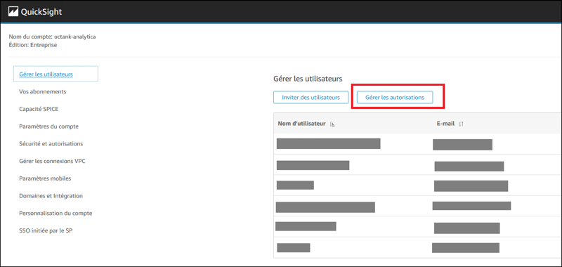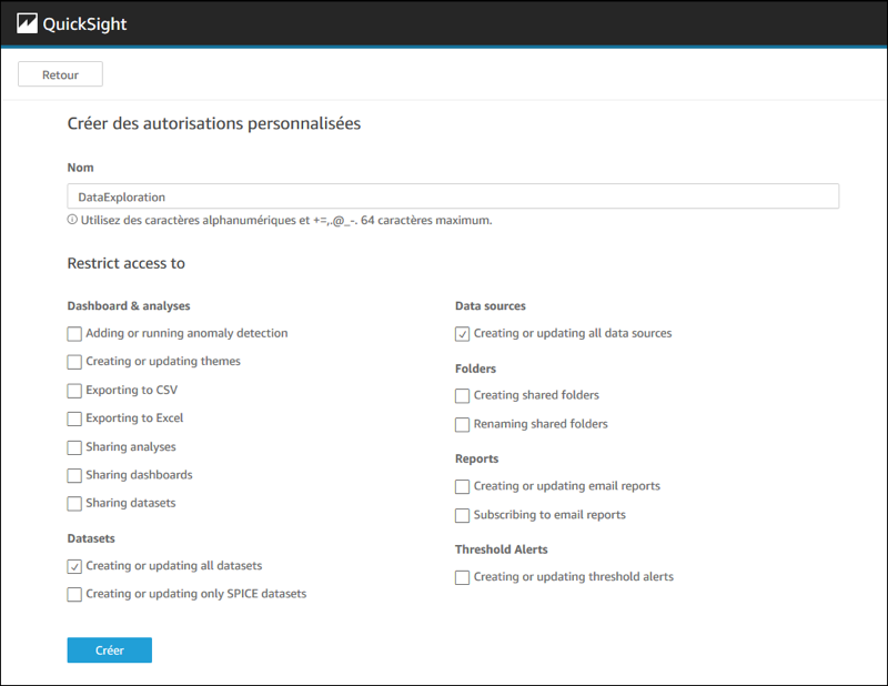 - Autorisations utilisateur personnalisées – Cette fonctionnalité vous permet de personnaliser les autorisations des auteurs, en retirant par exemple la possibilité de créer/éditer des sources ou des jeux de données. Cela permet aux administrateurs de fournir un ensemble restreint de fonctionnalités aux auteurs, qu’ils utilisent l’interface native de QuickSight ou bien l’intégration des fonctions de création, et ainsi de proposer une expérience contrôlée pour les auteurs qui disposeront ainsi uniquement des jeux et sources de données qui leurs sont nécessaires.