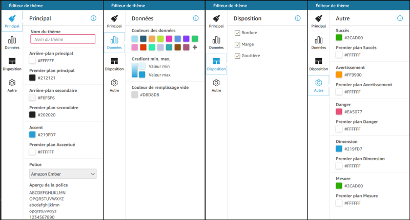 Avant que nous puissions commencer à travailler sur l’intégration des fonctions de création, nous pouvons configurer un thème par défaut pour les auteurs dans l’espace de noms de MaCompagnie. L’éditeur de thème de QuickSight vous permet de changer les couleurs, les polices de caractères et la dispositions des éléments qui sont utilisés dans le tableau de bord, comme on peut le voir dans l’illustration suivante.