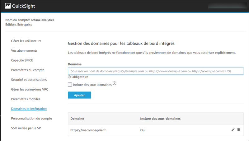 Premièrement, assurez-vous que le domaine dans lequel vous intègrerez QuickSight est autorisé dans vos paramètres d’administration QuickSight. Vous pouvez vérifier cela dans la page Domaines et intégration.