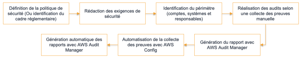 Si le cadre d’exigences est déjà connu et disponible depuis AWS Audit Manager, il conviendra alors de se concentrer sur la déclinaison et l’implémentation technique des exigences de sécurité, ainsi que sur l’automatisation de la collection des preuves et l’écriture des règles AWS Config associées.