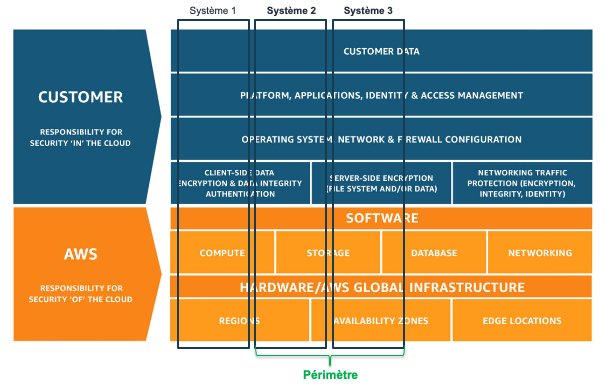 L’utilisation d’AWS est concomitante de l’adoption du modèle de responsabilité partagée. Conformément à ce dernier, l’audit de sécurité et de conformité conduit par les organisations clientes va donc se structurer selon les deux parties identifiées par ce dernier. L’enjeu premier sera alors de prouver à un auditeur que, sur le périmètre de l’audit, les deux parties sur lesquelles repose un système d’information sont conformes au cadre de référence considéré.