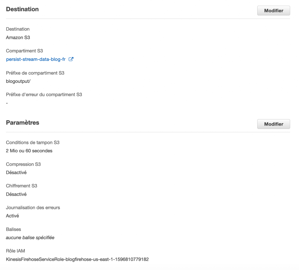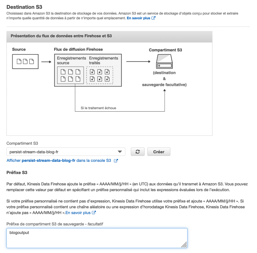 Il est nécessaire de créer un flux de données représentant les données brutes telles qu’elles arrivent, ainsi qu’un compartiment/bucket Amazon S3 ou les données vont être stockées. Pour plus d’information, référez-vous à ces liens pour Créer un flux de données et Créer un bucket.