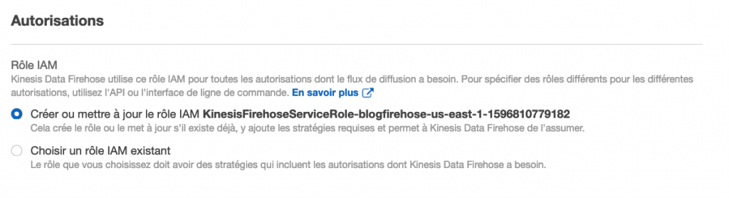 Dans cet article, nous considérons que vous n’avez pas créé le rôle AWS IAM qui octroiera les accès nécessaires à Amazon Kinesis Data Firehose, il convient de le créer maintenant : Dans la section Autorisations, choisissez Créer ou mettez à jour le rôle IAM.