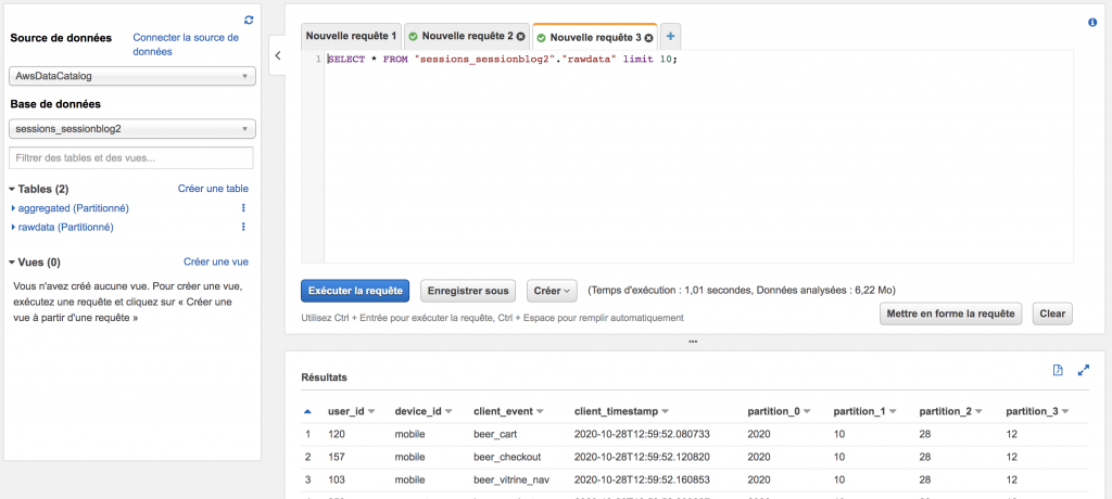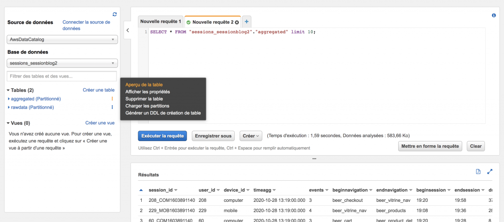 Sur la console Athena, choisissez la base de données de “sessionalization” dans la liste. Vous devriez voir deux tables créées à partir des données dans Amazon S3 : rawdata et aggregated.