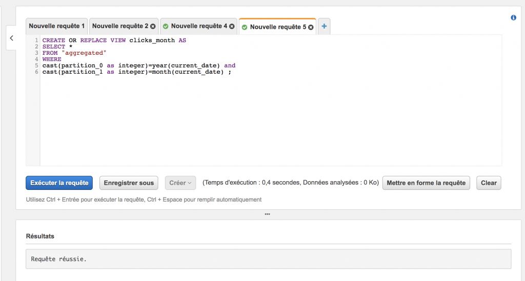 Étape 3 : Créez une vue dans la console Amazon Athena pour interroger uniquement les données du jour de votre table agrégée, comme suit :