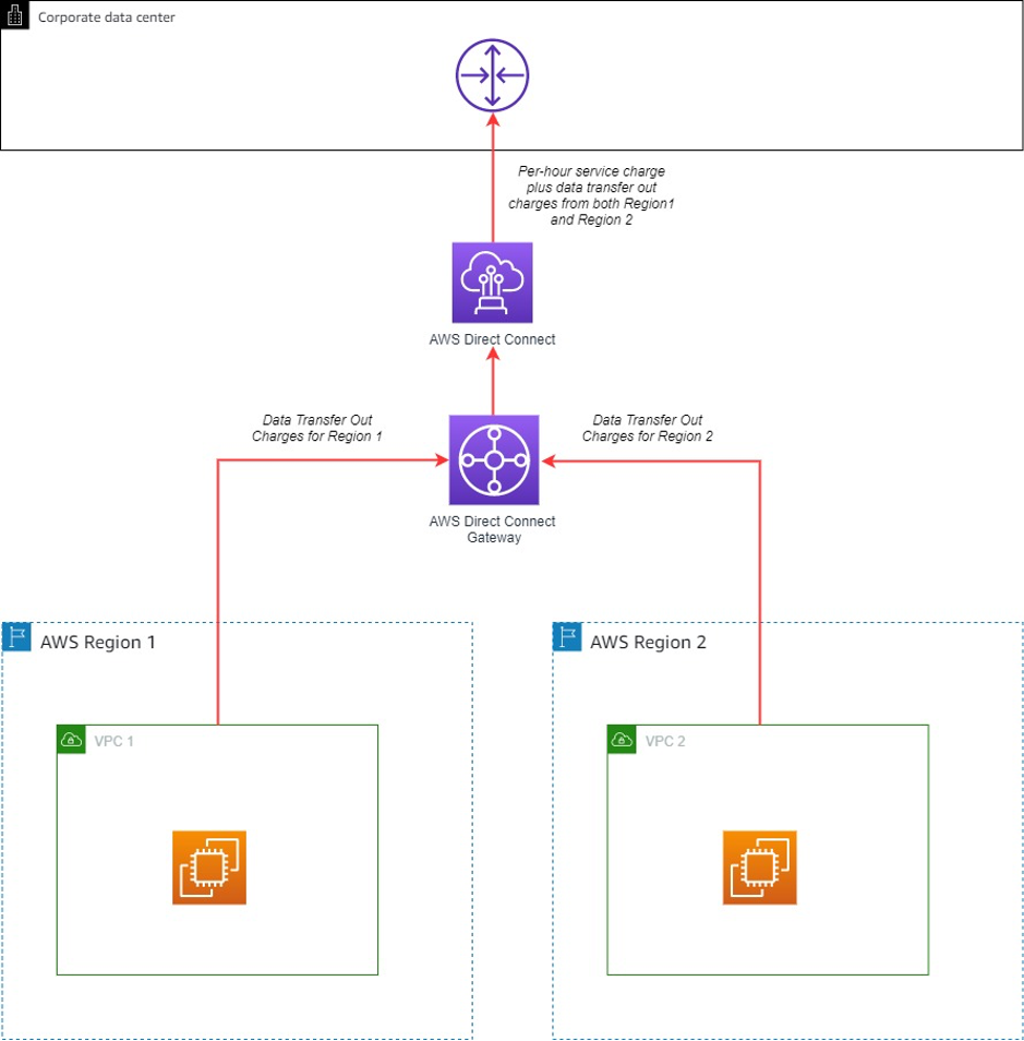 Direct Connect gateway dapat digunakan untuk membagi suatu Direct Connect secara lintas Region. Saat menggunakan Direct Connect gateway, akan ada biaya data keluar berdasarkan Region sumber dan lokasi Direct Connect (Gambar 10).