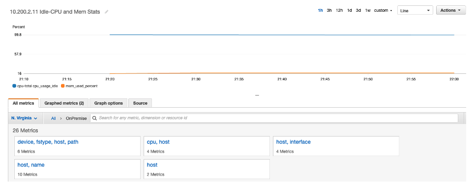 Akhirnya, kita dapat memeriksa CloudWatch Console untuk metrik server on-premise, di bawah bagian Custom Namespace. Anda dapat melihatnya dengan menavigasi ke konsol CloudWatch -> Metrics -> All Metrics.