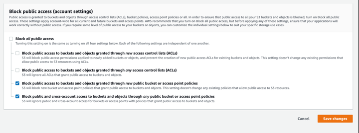 Bucket menyimpan semua berkas yang dapat diakses oleh publik dari Internet, jadi Anda harus memastikan bahwa pengaturan izin S3 pada level akun mengijinkan akses publik.