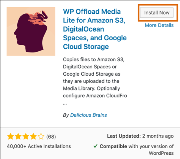 - Klik Install Now pada tampilan plugin WP Offload Media Lite.
