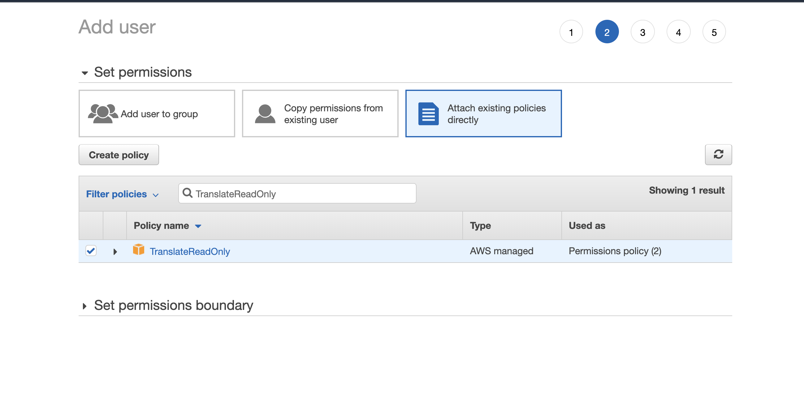 Plugin browser perlu dikonfigurasi dengan kredensial untuk dapat mengakses Amazon Translate. IAM dikonfigurasi dengan policy yang dikelola AWS yang bernama TranslateReadOnly. Policy ini memungkinkan pemanggilan API ke Amazon Translate. Untuk menyiapkan sebuah user IAM dengan hak read only, selesaikan langkah langkah berikut: