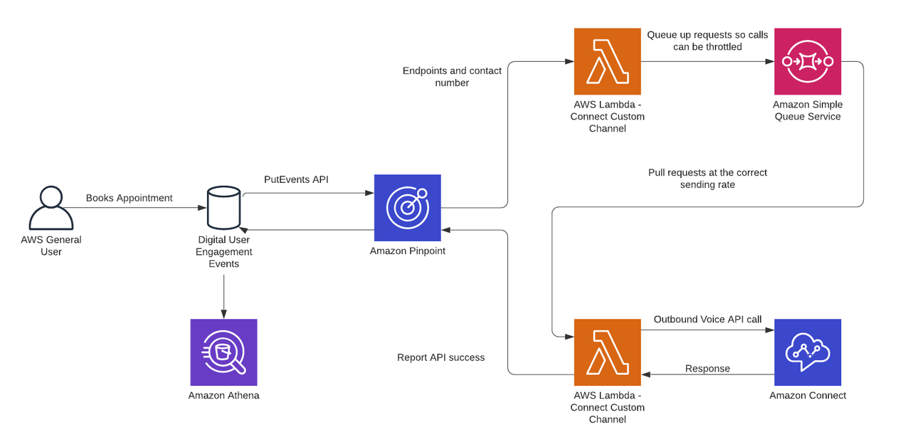 Untuk menggunakan layanan ini secara sinergis, Anda harus membuat custom channel pada Amazon Pinpoint, yang dapat dijalankan melalui fungsi AWS Lambda. Fungsi ini memungkinkan Anda memanggil API untuk memicu pengiriman pesan sebagai bagian dari kampanye Amazon Pinpoint. Amazon Pinpoint telah menyediakan fungsi AWS Lambda baru yang dapat digunakan untuk mengirim pesan suara melalui Amazon Connect. Konfigurasi ini memungkinkan Anda untuk menentukan pesan suara mana yang akan dikirim, menentukan segmen pengguna yang ingin Anda targetkan, dan mengirim pesan suara dalam skala besar melalui Amazon Connect melalui custom channel pada Amazon Pinpoint.