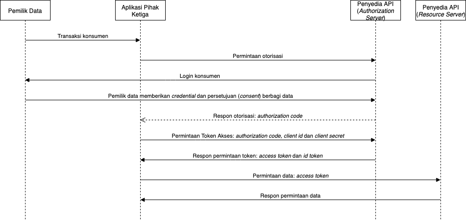 Berikut adalah alur interaksi untuk melakukan pengaturan persetujuan konsumen (consent management) dengan protokol OAuth 2.0 dan OpenID Connect: