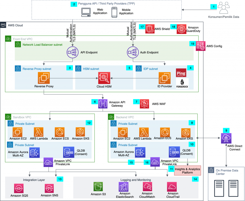 Berikut adalah contoh arsitektur acuan (reference architecture) implementasi Open Banking di platform AWS untuk lembaga keuangan Bank.