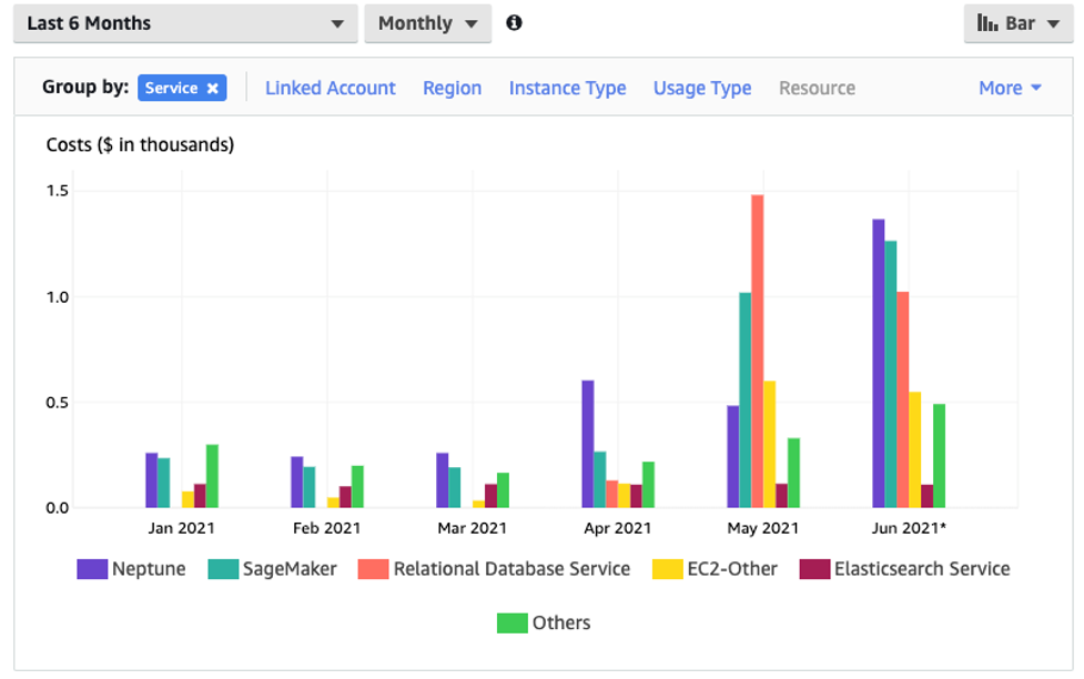 AWS Cost Explorer membantu Anda memahami tren pengeluaran biaya umum dengan cepat. Seiring skala bisnis Anda bertumbuh, begitu juga biaya infrastruktur Anda, dan Cost Explorer memberi Anda pandangan luas tentang pengeluaran itu. Tampilan beranda Cost Explorer menunjukkan enam bulan terakhir pembelanjaan Anda yang dikelompokkan berdasarkan layanan, yang akan membantu Anda menilai hal berikut: