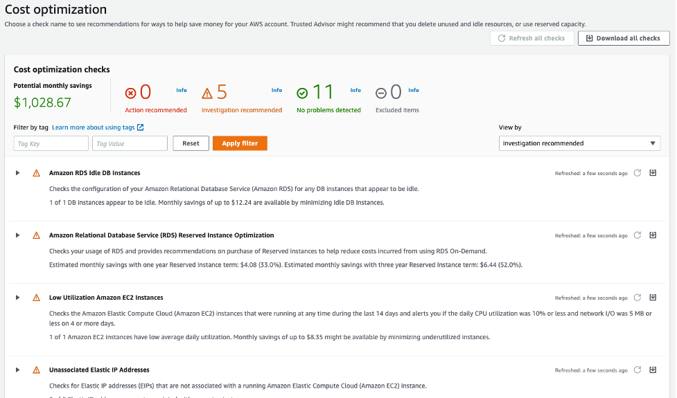 - Periksa Trusted Advisor: Pilar Pengoptimalan Biaya (Cost Optimization) dari Trusted Advisor, seperti yang ditunjukkan di bawah ini, akan menunjukkan komponen servis yang menganggur, dan merupakan titik awal yang baik untuk memeriksa sumber daya yang dapat dimatikan jika Anda belum menandai apa pun.