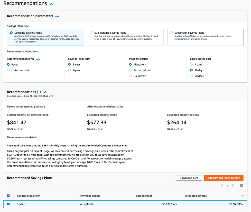 - Seberapa besar komitmen yang harus saya lakukan? Rekomendasi Savings Plan yang diberikan dalam AWS Cost Management memberikan nilai dasar tentang seberapa banyak yang harus dikomitmenkan. Karena Savings Plans adalah komitmen dolar per jam, rekomendasi tersebut diukur terhadap jumlah minimum komputasi yang Anda gunakan setiap jam. Anda dapat mengkombinasikan beberapa Savings Plan, jadi adalah suatu praktik yang baik untuk memulai dengan rencana konservatif, dan menambahkan lebih banyak rencana nanti jika Anda terus mencapai penggunaan 100%.