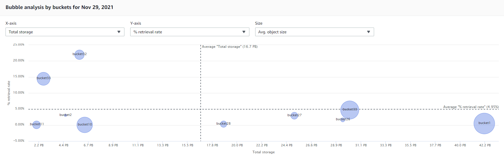 3.6: passa alla scheda Bucket e scorri verso il basso fino al grafico Analisi delle bolle. Seleziona Archiviazione totale, % velocità di recupero e Dimensione media dell'oggetto.