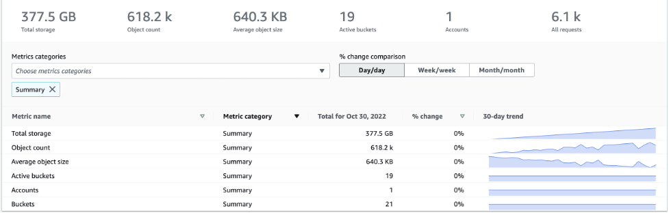 Tutti i clienti Amazon S3 possono accedere a un pannello di controllo interattivo nella console S3 che contiene viste preconfigurate dell'utilizzo dell'archiviazione e delle tendenze delle attività. Con i parametri gratuiti di S3 Storage Lens si ricevono 28 parametri a livello di bucket ed è possibile accedere per 14 giorni ai dati cronologici nel pannello di controllo. Puoi filtrare il pannello di controllo per riepilogo, ottimizzazione dei costi, protezione dei dati, gestione degli accessi, prestazioni o eventi in modo da analizzare parametri specifici per i casi d'uso previsti. Oltre al pannello di controllo della console S3, puoi esportare parametri in formato CSV o Parquet in un bucket S3 a scelta e utilizzarli in futuro. Per ulteriori informazioni sui parametri di utilizzo aggregati da S3 Storage Lens, consulta il glossario dei parametri di Amazon S3 Storage Lens.